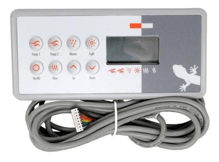 The Gecko TSC-8-GE1 topside features an LCD display that shows water temperature and includes seven or eight buttons (two overlays) to control the spas functions. It is compatible with select M-Series and S-Series spa packs.