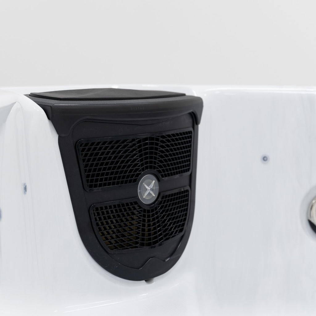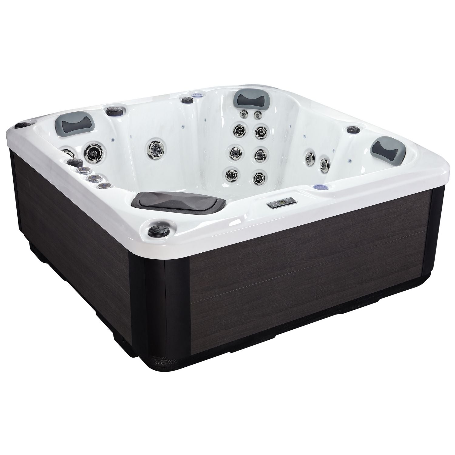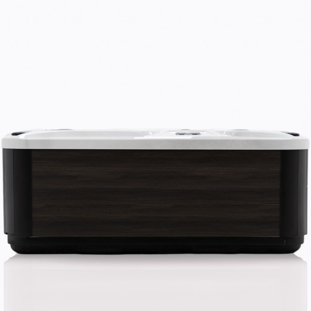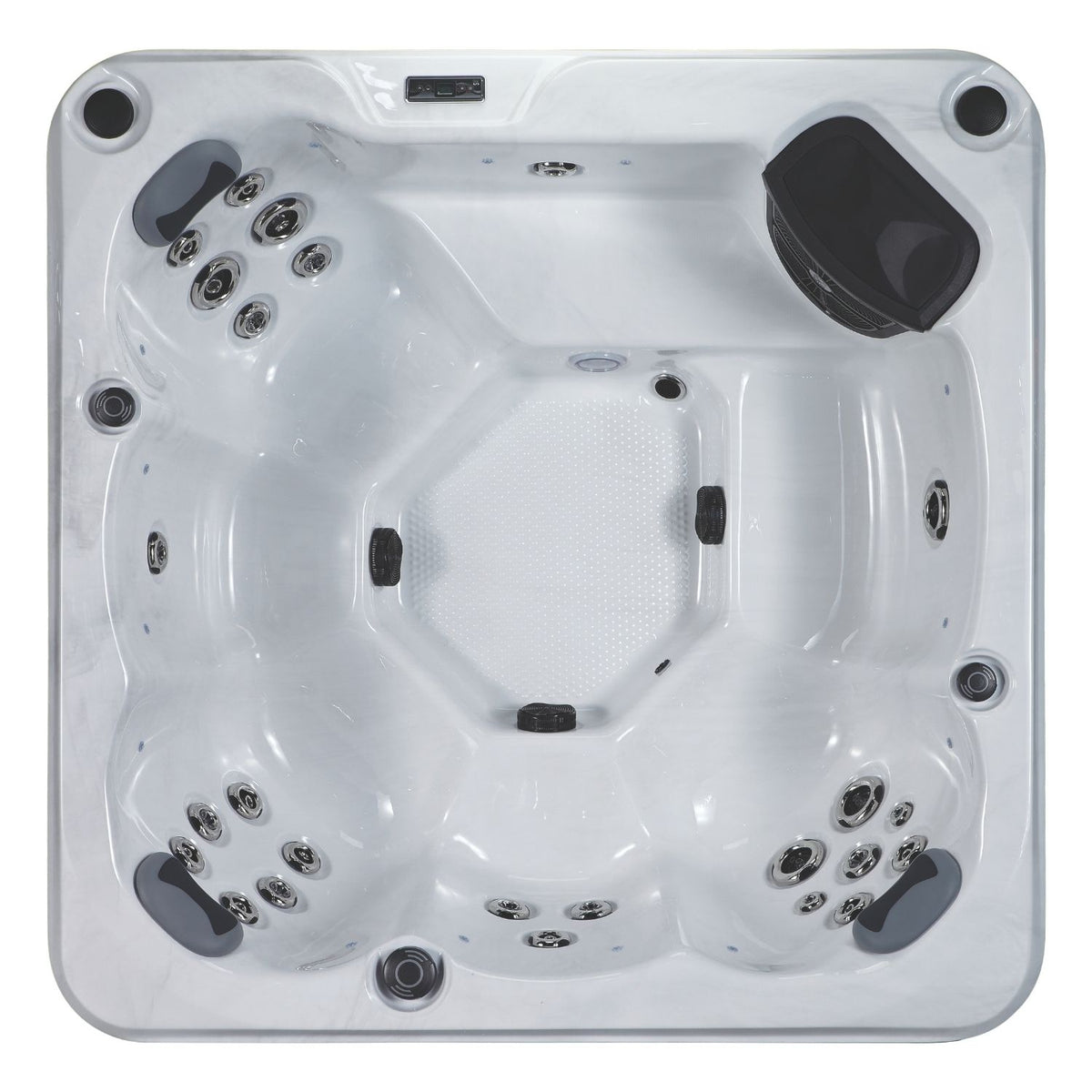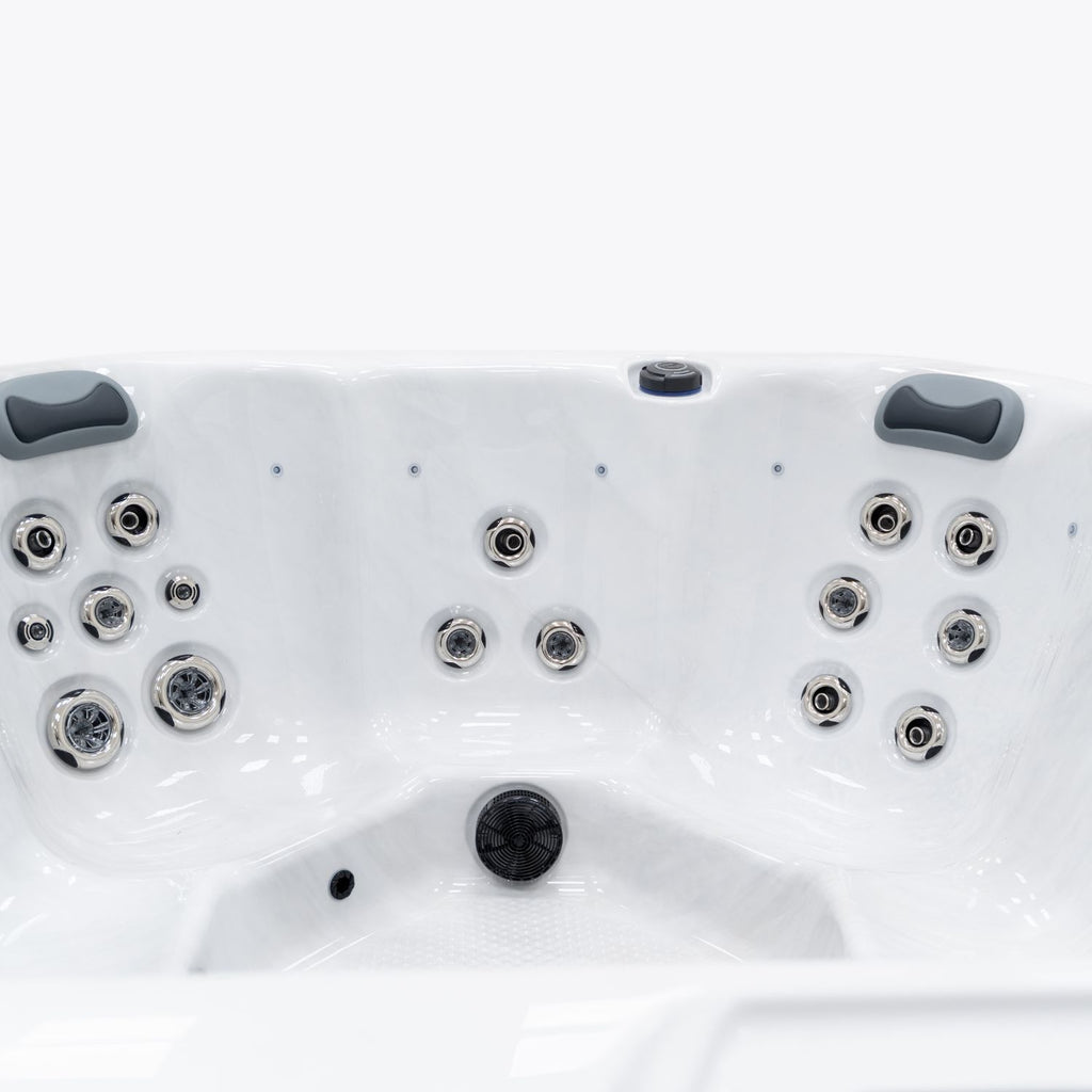 This carefully arranged jet layout ensures a balanced hydrotherapy experience, with powerful jets for muscle relief and smaller jets for soothing relaxation. Pure white acrylic over grey side panels.