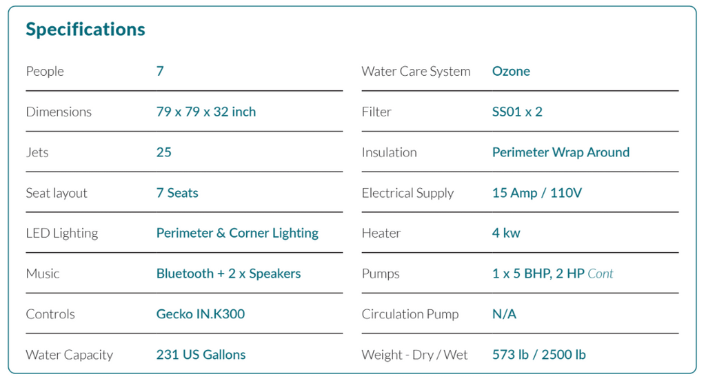 Equipped with 25 strategically placed jets, The Social Spa delivers a refreshing hydrotherapy experience that targets key muscle areas to alleviate tension and promote relaxation. Powered by a 2 HP, this model ensures consistent performance and efficient water circulation all while on a 120volt power supply.